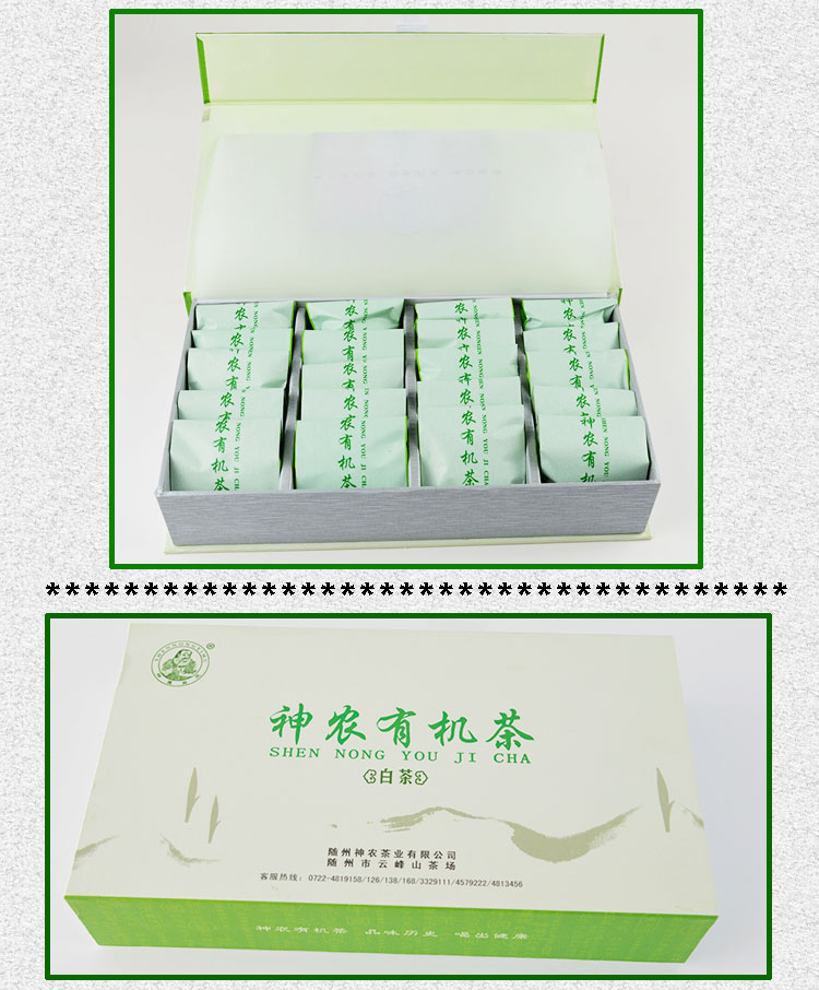 神農(nóng)有機(jī)茶系列之——白茶,采用綠茶加工工藝,選一芽二葉初展的白茶嫩葉為原料,經(jīng)殺青、理?xiàng)l、烘干、提香等工藝加工而制成,屬綠茶類。有機(jī)白茶外形挺直略扁,形如蘭蕙;色澤翠綠略帶金黃,白毫顯露;葉芽如金鑲碧鞘,內(nèi)裹銀箭。沖泡后,清香高揚(yáng)且持久,湯色嫩綠明亮,滋味鮮醇、馥郁,清潤甘爽,飲畢,唇齒留香,回味甘而生津。葉底嫩綠明亮,葉白脈翠,芽葉朵朵,十分可人。