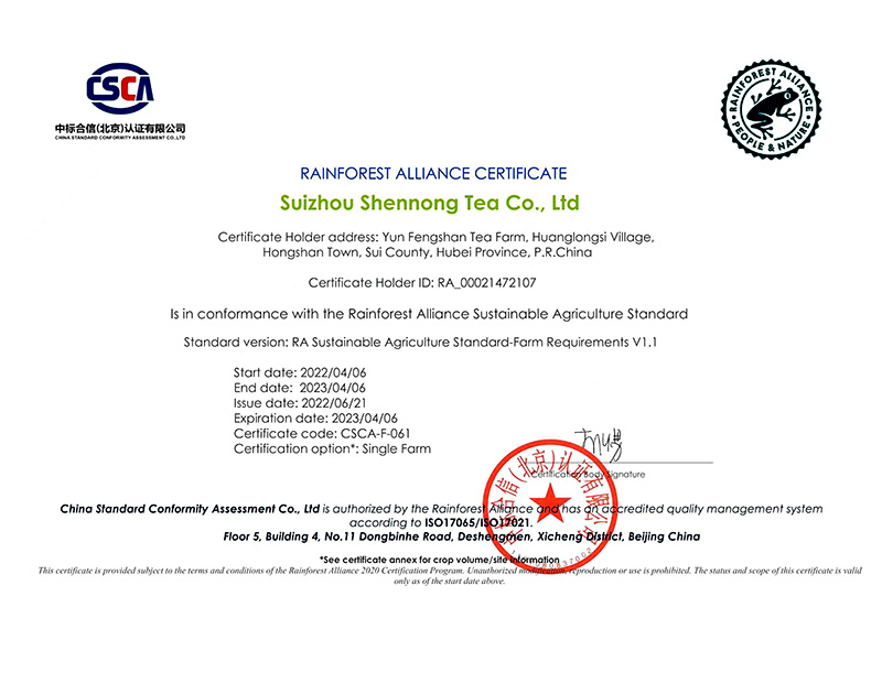 2023年4月6日,神農(nóng)茶業(yè)集團(tuán)再次通過雨林聯(lián)盟認(rèn)證
